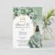 Elegant and classy sage green with gold-tone accents floral bough combined with an arched panel on a faded sage green background "Sweet 16" birthday party design. Features a dark brown to black-haired brunette beauty in a flowing sage-coloured ball gown and a faux alcohol and ink marbled back. Composite design by Holiday Hearts Designs.
