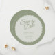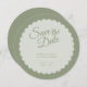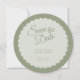 Elegant yet modern and with a touch of retro glam, this Wedding Save the Date card features a scalloped shaped circle, sage green and elegant script calligraphy. Customise this design with your own wedding information.