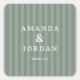 This square sticker features a sophisticated design with vertical stripes in two shades of muted green, creating an elegant and balanced look. The clean, sans-serif typography centres the names "Amanda & Jordan" in all caps, accompanied by a simple "thank you" below, conveying gratitude in a modern style. The minimalist aesthetic emphasises clarity and refinement, making it perfect for formal occasions or as a thoughtful thank-you note. Its understated elegance ensures versatility across various uses where a polished tone is desired.