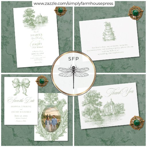 Make your wedding timeless with this elegant sage green vintage toile design. Featuring a detailed manor and estate sketch by the water, it is perfect for a sophisticated ceremony. This classic look adds a refined touch to your historic home or garden celebration. Created by Simply Farmhouse Press.