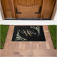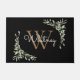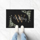 Elegant personalised greenery watercolor floral monogram doormat featuring a gold monogram initial with your name set in a modern white script on a chic black background. Designed by Thisisnotme©