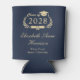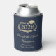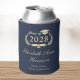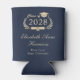 Toast the grad at their graduation party with this elegant dark blue can cooler featuring "Class of" in a light gold illustration of laurel wreath incorporating a grad cap and diploma, the graduate's name in a stylish light gold script, and their school name in modern light gold typography.