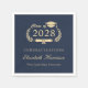 Elegant dark blue graduation party napkins featuring "Class of" in a light gold illustration of laurel wreath incorporating a grad cap and diploma, the graduate's name in a stylish light gold script, and "Congratulations" and their school name in modern light gold typography.