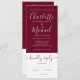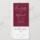 An all in one wedding invitation featuring modern signature script names and elegant typography on a burgundy background. The invitation includes an RSVP card that can be cut off and guest information details. Designed by Thisisnotme©