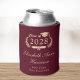 Toast the grad at their graduation party with this elegant burgundy red can cooler featuring "Class of" in a light gold illustration of laurel wreath incorporating a grad cap and diploma, the graduate's name in a stylish gold script, and their school name in modern gold typography.