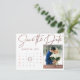 Elegant Script Photo Wedding Announcement Postcard. Simple yet elegant Save the Date Card. The front of the card has a calendar to mark the the wedding date and names of the bride and groom and space for the couple's photo . Back of the card has faux rose gold background with other wedding details along with the return address. The Card can be customised by moving the small square over the numbers to select the wedding date. For any further customisation , feel free to contact me.