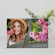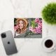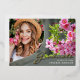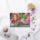 A unique photo graduation announcement card, featuring design elements of elegant handwritten style script with the word "Graduate" in real foil (foil colour options are gold, silver and rose). The graduates photo is enhanced by beautiful pink flowers with a sage green background. The back of the card offers personalised text spaces for information about the graduation and future journey. To see more items like this, visit my store here at "www.Zazzle.com/LakeViewCardCo". Thanks