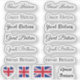Countour Stickers: Elegant script Name set - Great Britain & British Flag (UK Union Jack) - custom name in 6 x 2 different handwriting personal fonts. Cool black handwritten stickers allows you to mark your items, put name on with personal touch / name can be costumised