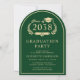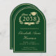Formal arch-shaped green college graduation party invitation featuring "Class of" in a classic gold illustration of a laurel wreath incorporating a grad cap and diploma, and the graduate's name in an elegant light gold script. Add their school, major, honours or future plans and the graduation party details in gold typography.
