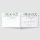 This wedding guest book features painted watercolor eucalyptus, botanical green, and light blue leaves with modern calligraphy.
