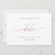 Announce your wedding date with this beautiful wedding save the date card. Modern hand written Script details in mauve lavender faux foil in front over white background. Back with unique Save the Date stamp/monogram with couples names in white over mauve lavender background. Clean and simple style. White and blush pink design. Same design with back with mauve lavender text and white background also available. Area for wedding website, more information or/and message for your guests (i.e. "Can't wait to see you there!").