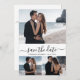 Elegant Minimalist Calligraphy Script 3-Photo Collage Wedding Save The Date Cards in Black and White. This meticulously crafted design is tailored for modern weddings, enchanting romantic allure. With its graceful 3-photo grid collage and captivating hand-lettered swash tail font, these cards encapsulate contemporary elegance. Effortlessly personalise each card with your treasured wedding details and pictures, offering a refined and sophisticated way to announce and celebrate your extraordinary day.