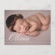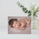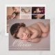 Modern birth announcement with one photo on the front and six on the back, accompanied by elegant white calligraphy script. All the colours can be customised. It can be personalised with your own message and baby stats.