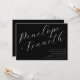 This contemporary wedding invitation features a sleek minimalist horizontal layout with the bride and groom’s names in beautiful script calligraphy, contrasting elegantly in white against a black background. Designed for a modern and budget-friendly wedding, it includes RSVP details directly on the invite for online responses, making it both stylish and convenient. Perfect for couples seeking a chic and simple way to announce their special day.