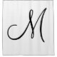 Personalised black monogrammed shower curtain with last name initial in black script font typography overlay printed on a solid colour white background. Elke Clarke© for MonogramGallery at Zazzle. Makes a great gift for newly weds as wedding gift for a bridal shower, couples shower or engagement party.