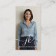 Elegant Script Monogram Logo Photo QR Code Business Card. Modern, stylish, custom colour vertical photo business card with a full bleed photo on the front featuring an elegant calligraphy swash script monogram with one or two letters as a photo overlay with your name and company, title or service. The back duplicates the text on the front of the card and includes your QR code and contact information featuring social media icons. CHANGES: Change the text font style, colour, size and placement and/or the background colour in EDIT (the sample shows black and white). ASSISTANCE: For help with design modification or personalisation or if you would like coordinating items, contact the designer BEFORE ORDERING via the Zazzle Chat MESSAGE tab or email makeitaboutyoustore@gmail.com.