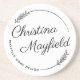 A chic, feminine sandstone coaster featuring an elegant calligraphy script name paired with a delicate botanical wreath and a small business tagline below. Perfect as a branded accessory for home-based businesses, interior designers, boutique owners, realtors, and creative entrepreneurs. The name and business name fields are fully customizable, and the cork backing protects surfaces from moisture.