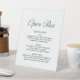 Welcome guests to your wedding reception with this classy minimalist "Open Bar" sign with a drinks list. The design features elegant black script and classic lettering on a white background, perfect for formal weddings and special occasions. You can customise the colours of the text and background to match your theme and wedding decor. Make a statement with this beautiful sign to let your guests know what complimentary drinks are available. Add a touch of elegance to your special day with this personalised sign. Order now and make your wedding reception even more memorable!