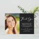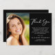 Elegant black graduation thank you card featuring the graduate's photo, "Thank You" in a stylish white script, your personalised thank you message and their name, school and class year in simple white typography.