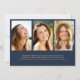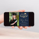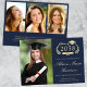 Modern dark blue college graduation announcement featuring "Class of" in a light gold illustration of laurel wreath incorporating a grad cap topper and diploma, a photo of the graduate and their name in an elegant light gold script. Add their school, major, honours or future plans. On the back, add 3 additional photos and your personalised message.
