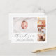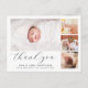 This chic timeless birth announcement and photo thank you postcard is ideal for anyone who wants to thank guests at their baby shower for the gifts, love, and support they have received and to introduce their new member of the family. The modern, elegant design has a minimalist style and features four customisable photos placed in the collage, simple elegant typography for your information, and a chic script for a ´´thank you´´ header. On the reverse, there is a customisable thank-you message with your names. Use the "customise" button to replace photos and edit text.