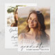 Elegant graduation party invitation featuring the grad's photo overlayed with "graduate" in a modern script and their name and class year in simple typography. On the reverse side, add an additional photo and the grad party details.