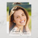 Elegant graduation thank you card featuring the graduate's photo overlayed with "thank you" in a stylish script and their name, school and class year in simple typography. On the reverse side, add an additional photo, personalise a thank you message and add the graduate's name in a signature-like script.