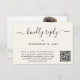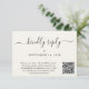 Elegant light cream wedding RSVP card featuring "kindly reply" in a chic swash script. Input your wedding website address to create a scannable QR code that your guests can scan to RSVP online. The reverse side features your photo overlayed with your first names and wedding date joined together with a heart.