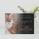 Elegant Script Photo QR Code Engagement Black. A modern minimalist design. Simply replace the sample photo with your own favourite. A black gradient overlay layer is on top of your photo so it fades out as it reaches the centre with the text partially overlaid on top. Engagement is in a modern set script and easily personalise the rest of the text. With parties in mind taking place in a hotel or restaurant (or any venue with a website), replace the QR code on the back with a QR code to their website. Simply change the sample url with the url of your venue to automatically generate the QR code. You can also delete the QR code and text on the back if not required via customise further.