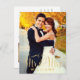 Personalised wedding thank you post card template features a photo on the front and back, "Mr. & Mrs." in an elegant champagne gold coloured script font with the married last name, and custom black text thank you message that can be personalised.