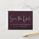 Elegant watercolor deep purple cassis background, wedding save the date postcard. Card features elegant calligraphy "Save the Date", on front and back. Coordinating floral accent bouquet.