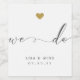 Custom-designed wedding wine and sparkling wine bottle labels featuring "we do" modern calligraphy design with a gold glitter heart.
