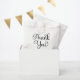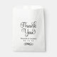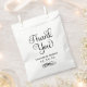 Wedding favour bags feature a "Thank You" black coloured decorative script writing design with custom monogram design that includes the bride and groom names and wedding date.
