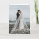 Elegant white script overlay, wedding photo thank you card. Front of card features single photo template. Inside of card features space for your custom message, names and event date.