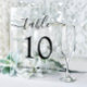 Elegant transparent wedding table number acrylic sign featuring "table" in a stylish calligraphy script with swashes, the table number in elegant serif typography, your first names joined by a heart and your reception date. Create each table number sign and add to your shopping cart one at a time, then check out once all numbers are in your cart.