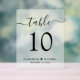 Elegant frosted acrylic wedding table number sign featuring "table" in a stylish calligraphy script with swashes, the table number in classic serif typography, your first names joined by a heart and your reception date. Create each table number sign and add to your shopping cart one at a time, then check out once all numbers are in your shopping cart.