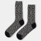 These crew socks are an elegant pattern of black and white damask with fancy white scrolls on a black background.