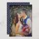 This Happy New Year photo card design shown for a newlywed couple features a portrait photo from the wedding day with a stylish white custom text overlay design and scroll frame. The back of the card features a deep navy / midnight blue background colour that can be modified with a white arrow pattern.