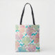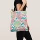 This elegant tote bag for her features faux glitter, colourful seashells in multiple colours of teal, coral pink, aqua, and gold. The shells are placed on aqua blue chevron stripes that also contain images of the shell pattern, and those are contrasted with white chevron stripes. Both sides of the bag have the same image.
