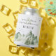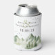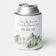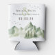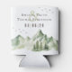 Watercolor landscape painting of trees, flying birds and montains in the background. Calm and serene nature illustration with pine trees and silhuettes of flying birds. Add names of bride and groom and the wedding date on this personalises can cooler.