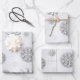 Elegant wrapping paper sheet design featuring stylised snowflakes on silver background.