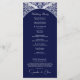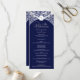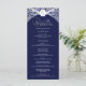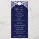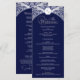 This wedding program card features a deep blue background highlighted with ornate silver flourishes for a refined and formal appearance. A crest at the top elegantly frames the monogram initials, while the central section showcases the couple’s names and the complete wedding service details in a clean and organised format. The pairing of rich blue with shimmering silver creates a timeless and sophisticated design, perfect for evening weddings and classic celebrations.