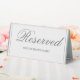 An elegant silver script calligraphy reserved table wedding design featuring a double silver border with minimalist modern chic typography on a white background for your wedding table setting designed by Danielle Fernandez.