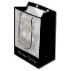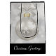 Gift bag with a magical holiday design. Featuring a silver Christmas ball with snowflake decorations and finished off with a pretty silver bow. The background is a silver bokeh lights illustration with elegant stars scattered throughout.