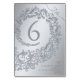 This wedding table number card features an elegant and decorative ornate frame created with intricate damask patterns in shimmering silver tones. The circular damask border surrounds the bold table number at the centre, giving the card a refined and sophisticated look. The word “Table” is styled in graceful script, adding a touch of romance to the design.