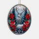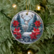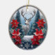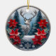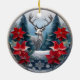 This round ceramic deer ornament features an elegant silver coloured frame that encircles a poinsettias festive design. The background showcases a serene Christmas scene, picturesque trees and winter snow landscape. A reindeer gracefully shows off his antlers, adding a touch of magic and Xmas holiday spirit to the ornament. Same Image is on the front and back. This ensures that no matter how the ornament turns, it always looks festive and complete. 🦌🎄