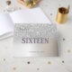 Elegant chic sweet 16 on silver glitter bokeh background.