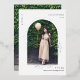This elegant real foil white and silver botanical graduation announcement card features a front photo arch with leafy silver frame, and a full photo back of the card.