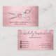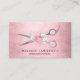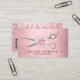 Modern and elegant business cards for hairstylists with faux silver scissors, pink and white roses, faux pink rose gold background and elegant calligraphy font.