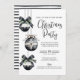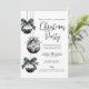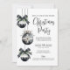 Invite guests to your holiday celebration with this fun yet minimalist Christmas ornament-themed invitation. The design features three elegant black and white watercolor ornaments cascading down the left side, accented with evergreen greenery and bow details for a festive, stylish touch. All of the party details are laid out clearly on the right side in a mix of modern script and serif fonts, creating a clean and balanced look.